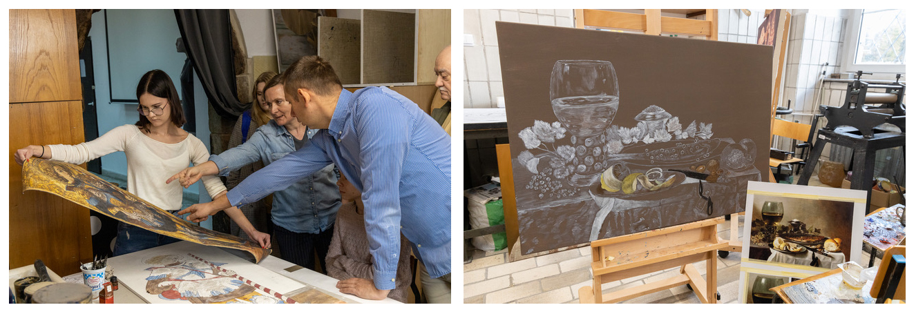 Na zajęciach z w/w specjalizacji prace uczniów, będące twórczą interpretacją dzieł wielkich mistrzów, wykonywane są w oparciu o specjalistyczną wiedzę technologiczną, z użyciem współcześnie dostępnych narzędzi i materiałów. Uczniowie poznają specyfikę i warsztat malarski właściwy dla technik wodnych (akwareli, gwaszu, tempery, akrylu), suchego pastelu oraz technik olejnych na płótnie oraz desce. W zakresie technik pozłotniczych zgłębiają technologię tradycyjnego złocenia (złotem i szlagmetalem na mikstion i pulment) oraz złoceń syntetycznych. Oprócz prac malarskich uczniowie projektują i realizują formy użytkowe z wykorzystaniem poznanych technik. Podczas zajęć oraz warsztatów można: nauczyć się całego procesu wykonawczego od projektu do jego realizacji na zlecenie lub wg samodzielnego tematu; * udoskonalić warsztat malarski w zakresie podstawowych technik tj. pastele, akwarele, tempera wodna, oleje, akryle itp. na różnych formatach i podłożach, w zależności od specyfiki zadania; * poznać historyczne techniki malarstwa sztalugowego i dekoracyjnego tj. enkaustyki, freski, mozaiki, różne odmiany temper, w szczególności ikonę, jako dziedzictwo regionalne. * posiąść umiejętność złocenia na tzw. mixtiona i tzw. pullment * wykonywać kopie w technikach historycznych oraz tematy kreacyjne * nauczyć się świadomego doboru technik i ich możliwości do realizowanego zadania * nauczyć się projektować oprawy, przedmioty użytkowe